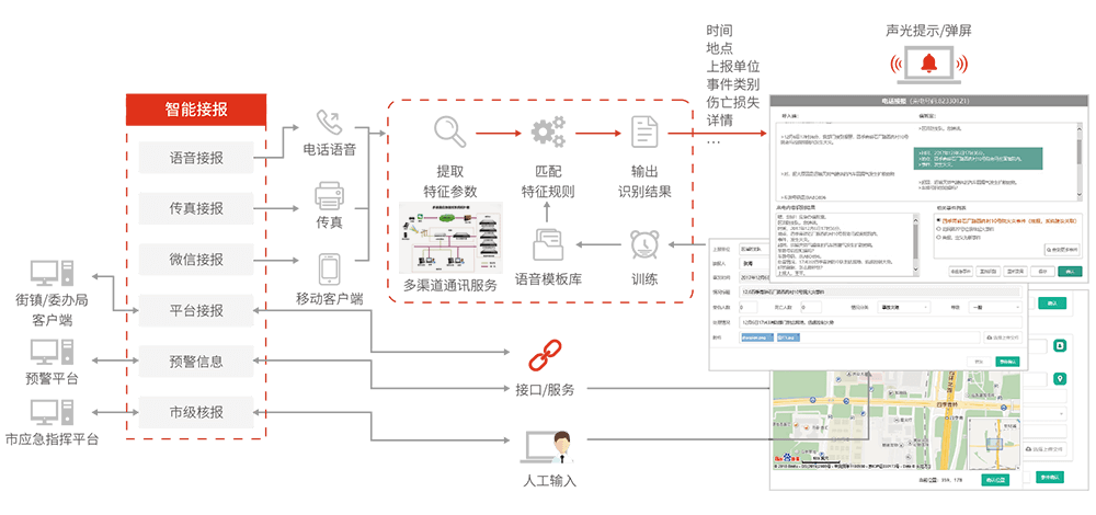 智能接報(bào)——通過語音識(shí)別、文字識(shí)別、智能語義分析、機(jī)器深度學(xué)習(xí)等技術(shù)手段自動(dòng)識(shí)別接報(bào)內(nèi)容并轉(zhuǎn)換成相應(yīng)格式的文本信息。系統(tǒng)對(duì)接報(bào)內(nèi)容智能分析后,根據(jù)語義分析結(jié)果和預(yù)案庫中的應(yīng)急預(yù)案進(jìn)行智能匹配,自動(dòng)生成應(yīng)急處置方案和結(jié)構(gòu)化指令。