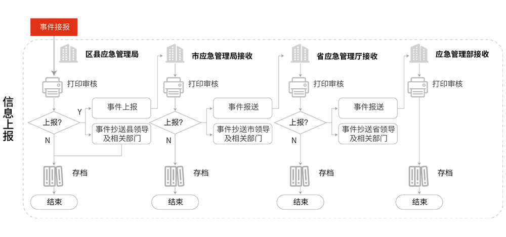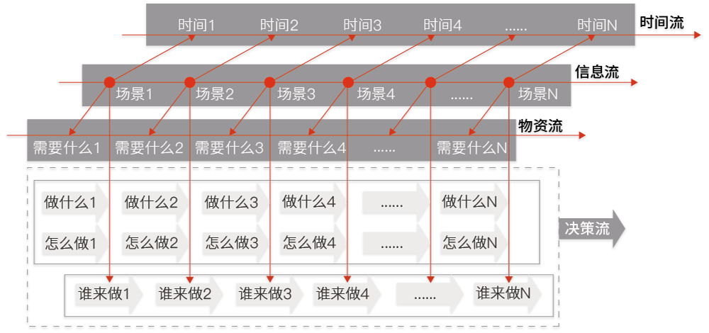 應(yīng)急預(yù)案數(shù)字化流程——突發(fā)事件發(fā)生后各職能部門采取相應(yīng)的響應(yīng)行動(dòng),按照應(yīng)急預(yù)案中涉及到的應(yīng)急響應(yīng)流程對(duì)應(yīng)急預(yù)案進(jìn)行數(shù)字化處理,包含事件流、信息流、物資流和決策流。