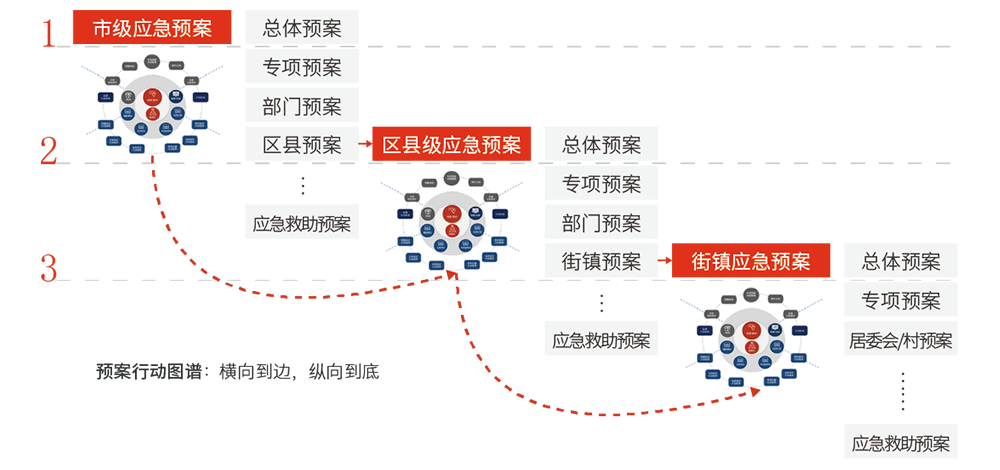 預(yù)案行動(dòng)圖譜——圍繞事件鏈、空間鏈、時(shí)間鏈,采用大數(shù)據(jù)分析技術(shù)形成預(yù)案行動(dòng)知識(shí)圖譜,根據(jù)事件類型和等級(jí)自動(dòng)生成結(jié)構(gòu)化處置方案,實(shí)現(xiàn)應(yīng)急職責(zé)指令化、資源調(diào)度可視化、指揮體系化、處置流程化、推演自動(dòng)化、評(píng)估智能化。
