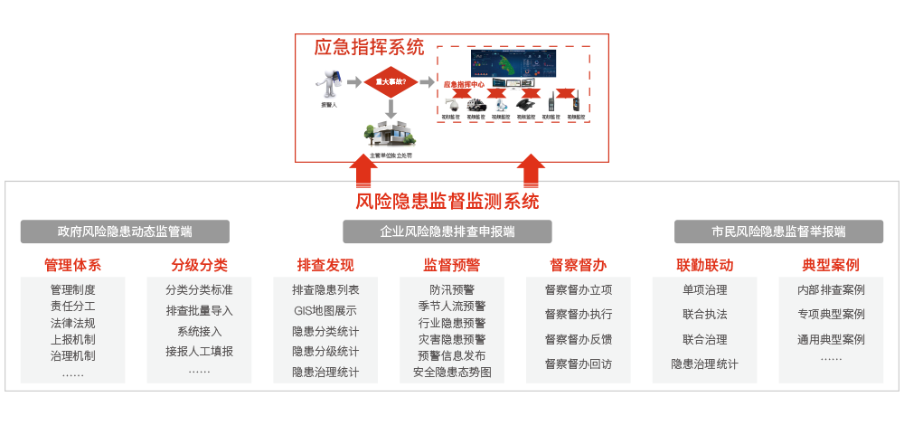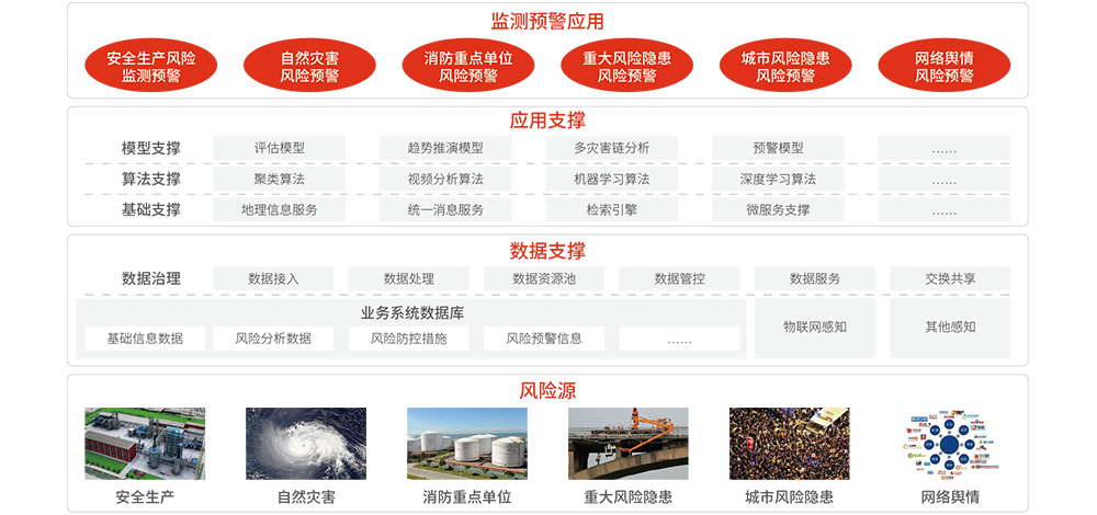 對(duì)行業(yè)高危領(lǐng)域安全、自然災(zāi)害、城市安全、重大基礎(chǔ)設(shè)施和輿情等風(fēng)險(xiǎn)的全面監(jiān)測(cè)監(jiān)控和風(fēng)險(xiǎn)評(píng)估,為防災(zāi)減災(zāi)策略制定及指揮調(diào)度業(yè)務(wù)的開展提供信息支撐。主要包括安全生產(chǎn)風(fēng)險(xiǎn)監(jiān)測(cè)預(yù)警、自然災(zāi)害綜合監(jiān)測(cè)預(yù)警、防火重點(diǎn)單位火災(zāi)監(jiān)測(cè)預(yù)警、重大基礎(chǔ)設(shè)施監(jiān)測(cè)預(yù)警、多災(zāi)種和災(zāi)害鏈綜合監(jiān)測(cè)預(yù)警、互聯(lián)網(wǎng)輿情監(jiān)測(cè)預(yù)警和重大風(fēng)險(xiǎn)隱患排查。