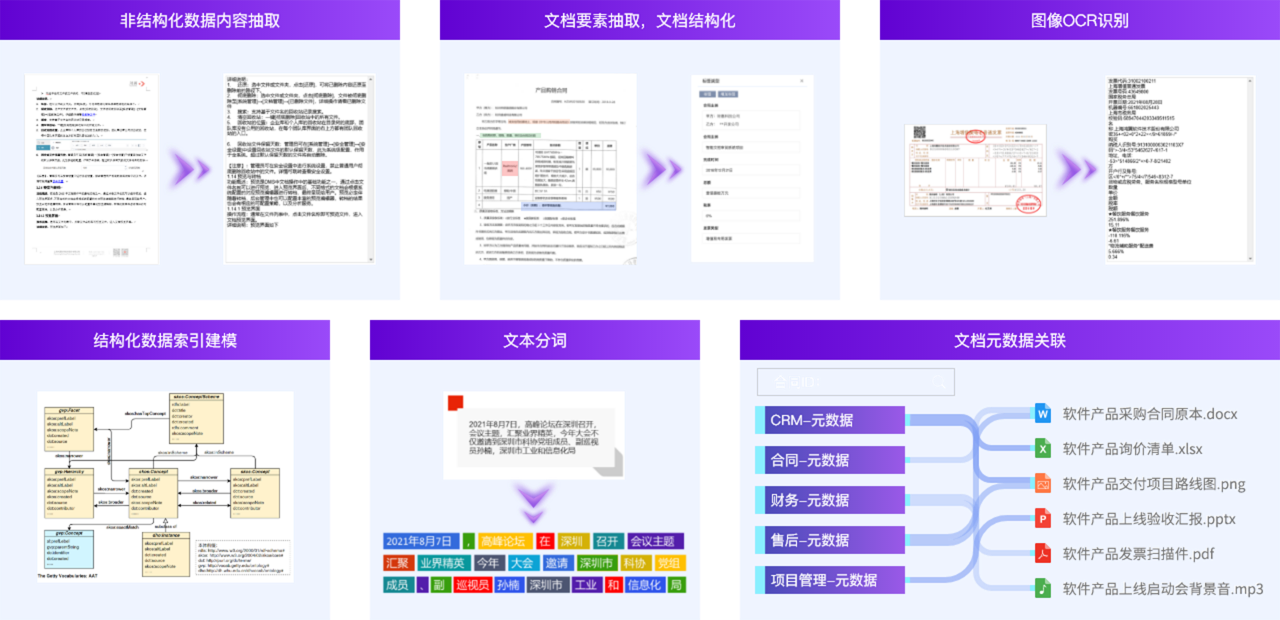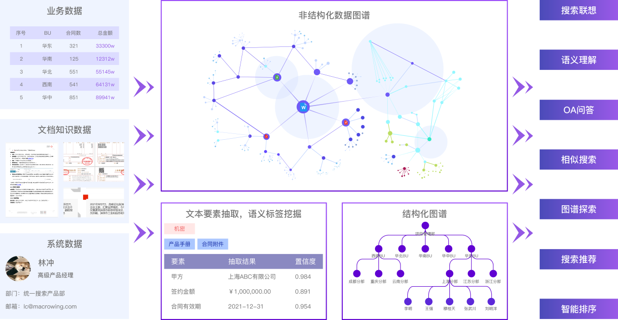 進(jìn)而實(shí)現(xiàn)跨系統(tǒng)全站統(tǒng)一智能搜索。結(jié)構(gòu)化數(shù)據(jù)對(duì)字段進(jìn)行索引建模,非結(jié)構(gòu)化數(shù)據(jù)通過(guò)內(nèi)容抽取和智能要素抽取進(jìn)行索引建模,