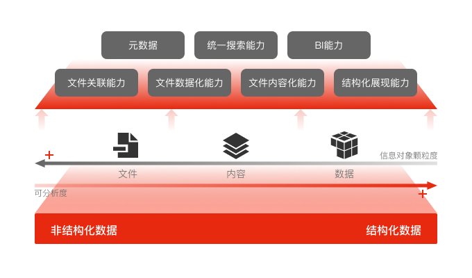 將文件拆分成顆粒度更細(xì)的內(nèi)容,內(nèi)容轉(zhuǎn)化為數(shù)據(jù),完成非結(jié)構(gòu)化數(shù)據(jù)向結(jié)構(gòu)化數(shù)據(jù)的轉(zhuǎn)換,提升文件可分析度,實(shí)現(xiàn)文件關(guān)聯(lián)、文件數(shù)據(jù)化與文件內(nèi)容化,結(jié)構(gòu)化展現(xiàn)數(shù)據(jù)內(nèi)容,助力數(shù)據(jù)分析與價(jià)值挖掘。