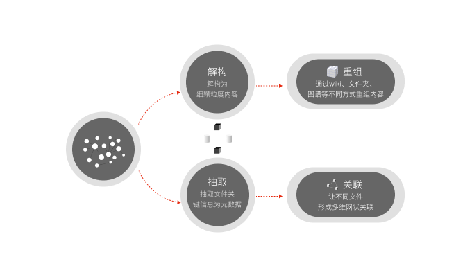 對(duì)文件進(jìn)行數(shù)據(jù)化解構(gòu),將大顆粒度的文檔轉(zhuǎn)化為細(xì)顆粒度的內(nèi)容,抽取文檔關(guān)鍵信息轉(zhuǎn)化為元數(shù)據(jù),以內(nèi)容專輯、wiki等方式結(jié)構(gòu)化重組,創(chuàng)造文件間多維網(wǎng)狀關(guān)聯(lián),降低知識(shí)獲取門檻,發(fā)揮知識(shí)在企業(yè)發(fā)展中的引導(dǎo)作用。