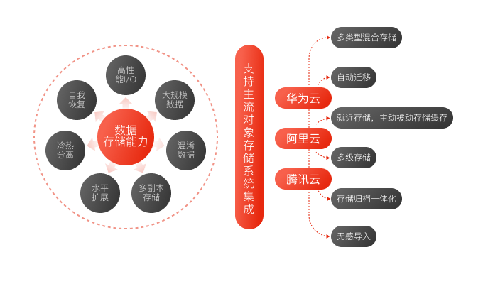 提供本地存儲(chǔ)、對(duì)象存儲(chǔ)等多種存儲(chǔ)方式,支持混合存儲(chǔ),兼容主流對(duì)象存儲(chǔ)系統(tǒng),能夠?qū)崿F(xiàn)就近存儲(chǔ)與多級(jí)存儲(chǔ),同時(shí)支持?jǐn)?shù)據(jù)自動(dòng)遷移,文件無(wú)感導(dǎo)入,提升存儲(chǔ)性能。