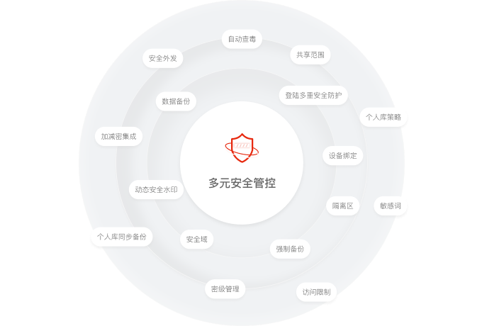 支持多種登錄驗(yàn)證方式、安全域、訪問設(shè)備綁定,規(guī)范用戶訪問與共享范圍;數(shù)據(jù)可實(shí)時(shí)同步備份,防止企業(yè)資產(chǎn)流失;自動(dòng)檢測(cè)敏感詞與查毒,支持安全外發(fā)、動(dòng)態(tài)安全水印,兼容主流加解密廠商,在保障數(shù)據(jù)文件安全的同時(shí),加速企業(yè)數(shù)據(jù)在上下游業(yè)務(wù)鏈中的流動(dòng)。