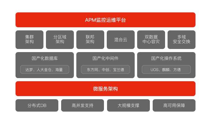 基于docker容器的微服務(wù)架構(gòu),靈活高可用,多種應(yīng)用架構(gòu),能夠針對(duì)不同業(yè)務(wù)場(chǎng)景進(jìn)行部署;適配主流國(guó)產(chǎn)化軟硬件,支持分布式數(shù)據(jù)庫(kù),大規(guī)模情況下表現(xiàn)優(yōu)異;自有APM監(jiān)控運(yùn)維平臺(tái),保障系統(tǒng)平穩(wěn)運(yùn)行。