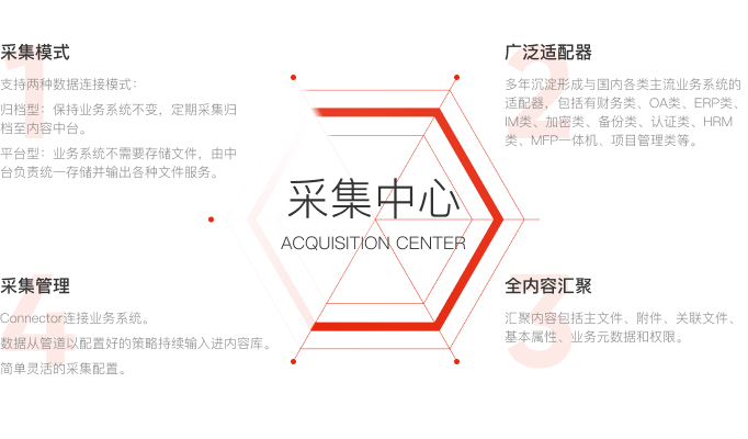 支持歸檔型與平臺(tái)型兩種采集模式,對(duì)文件、基礎(chǔ)屬性、元數(shù)據(jù)、文檔權(quán)限與動(dòng)態(tài)子目錄等數(shù)據(jù)進(jìn)行采集,能夠通過配置自動(dòng)執(zhí)行采集任務(wù),配備豐富的行業(yè)插件,實(shí)現(xiàn)跨系統(tǒng)的數(shù)據(jù)全連接。
